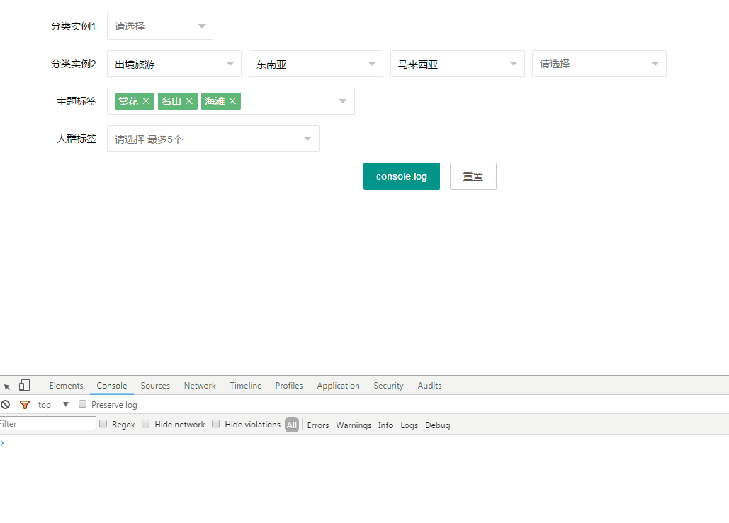console.log('catIns1 当前选中的值名:',catIns1.selected);